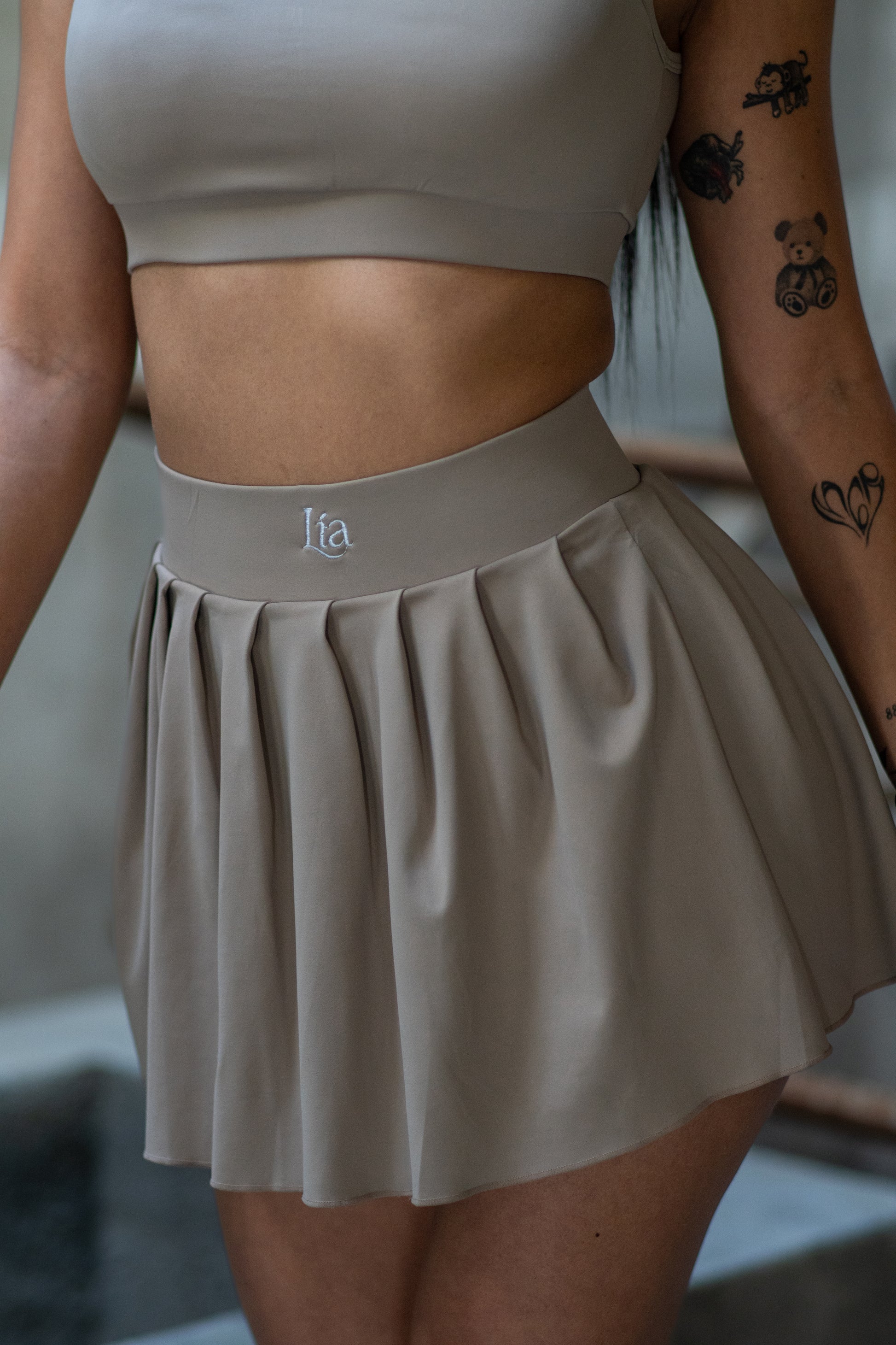 Falda tela durazno, tableada con short