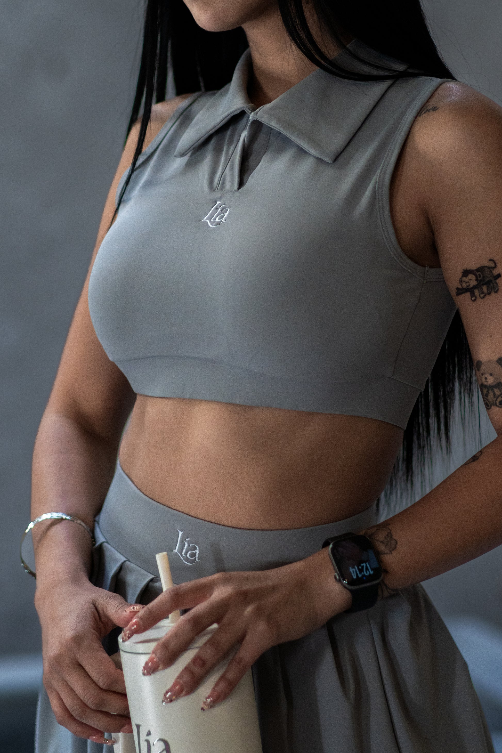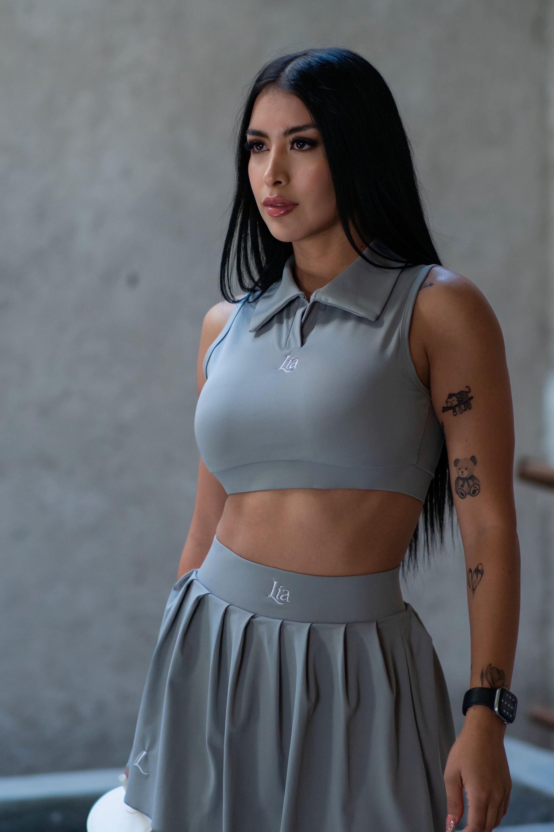 Conjunto de dos piezas,falda con short y top con copas, tela durazno